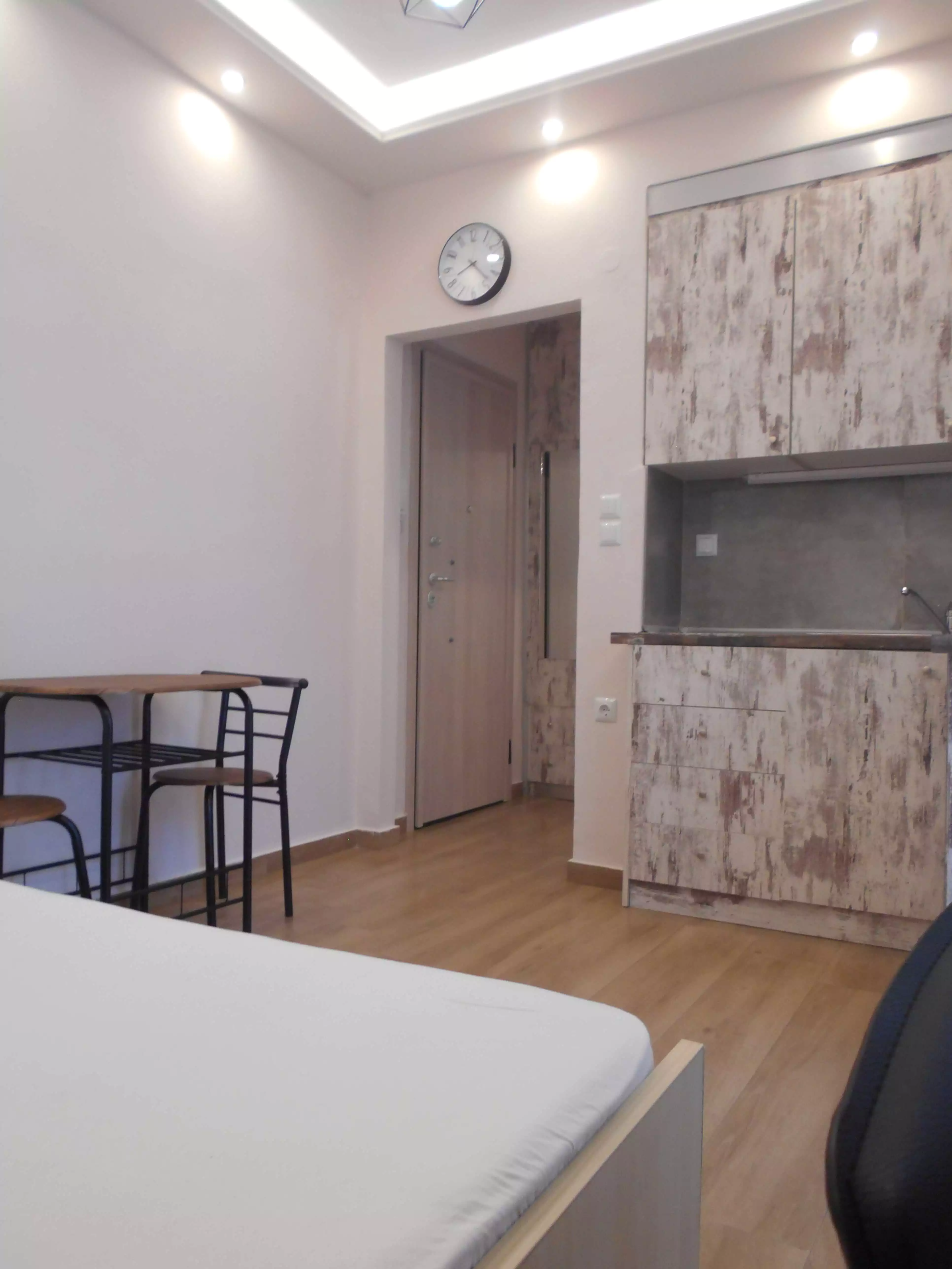 Ολική ανακαίνιση σε στούντιο 22 τ.μ. αποτελούμενο από ενιαίο χώρο υπνοδωματίου με εντοιχισμένη ντουλάπα, κουζινάκι, μπάνιο με ντουζιέρα και μπαλκόνι με κλειστό χώρο αποθήκευσης.