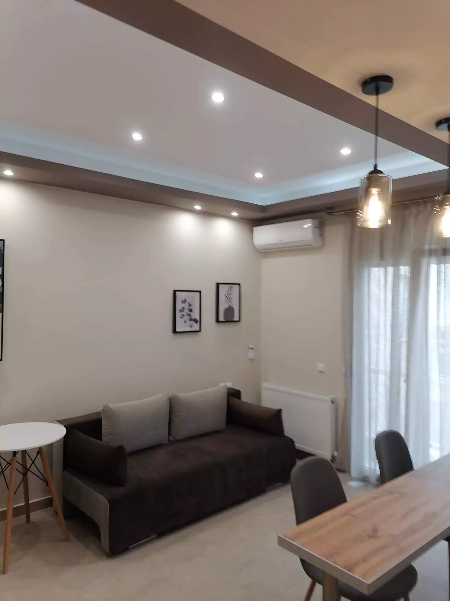 Στον χώρο της σαλονοκουζίνας έχει τοποθετηθεί γυψοσανίδα η οποία διαχωρίζει και «κρύβει» την κουζίνα από το σαλόνι, ενώ στο υπνοδωμάτιο δημιουργήθηκε μία γύψινη κατασκευή με σποτάκια φωτιστικού. Το ακίνητο παραδόθηκε στον πελάτη πλήρως επιπλωμένο και εξοπλισμένο και εκμισθώθηκε πριν την αποπεράτωση της ανακαίνισης.
