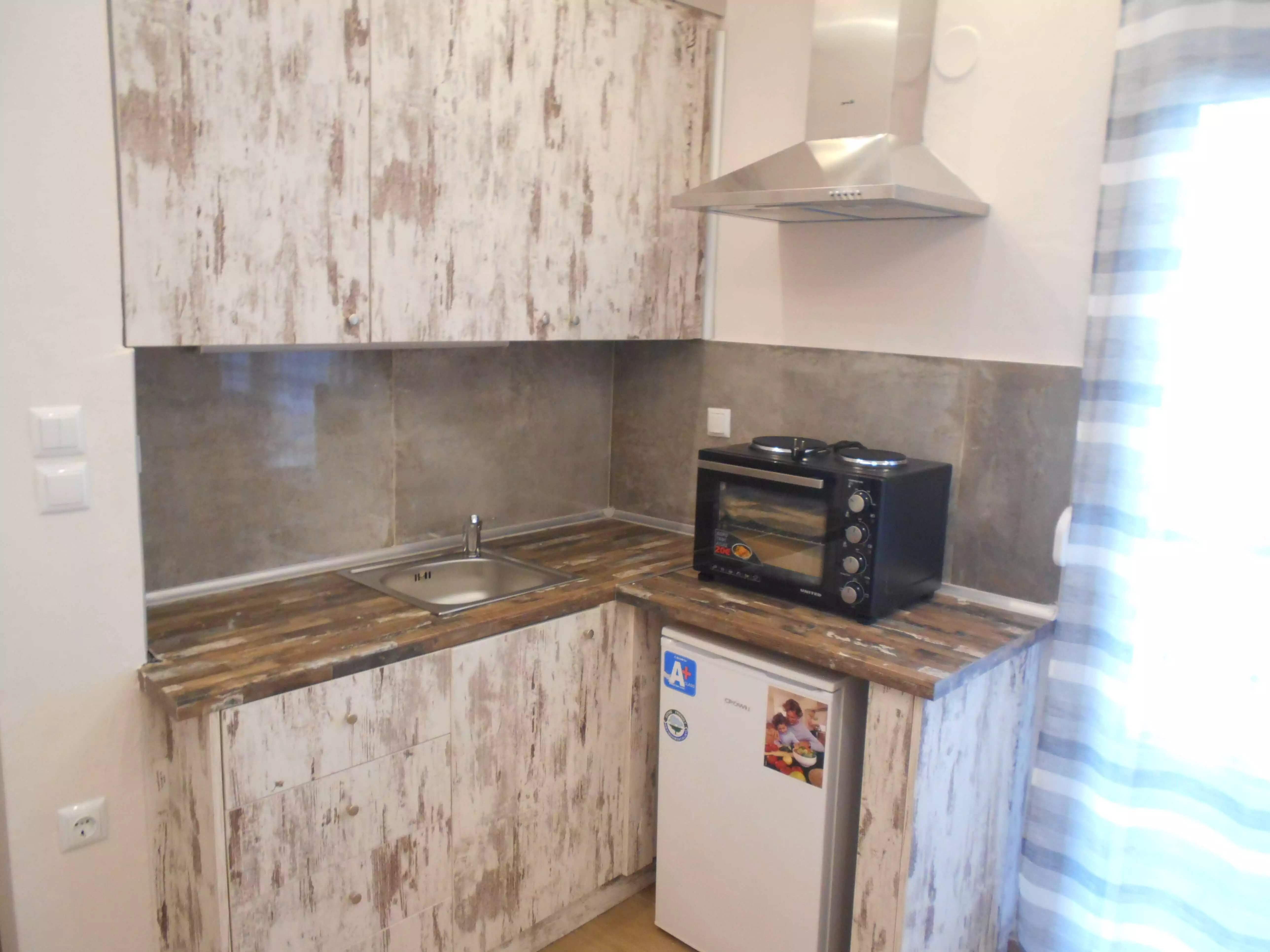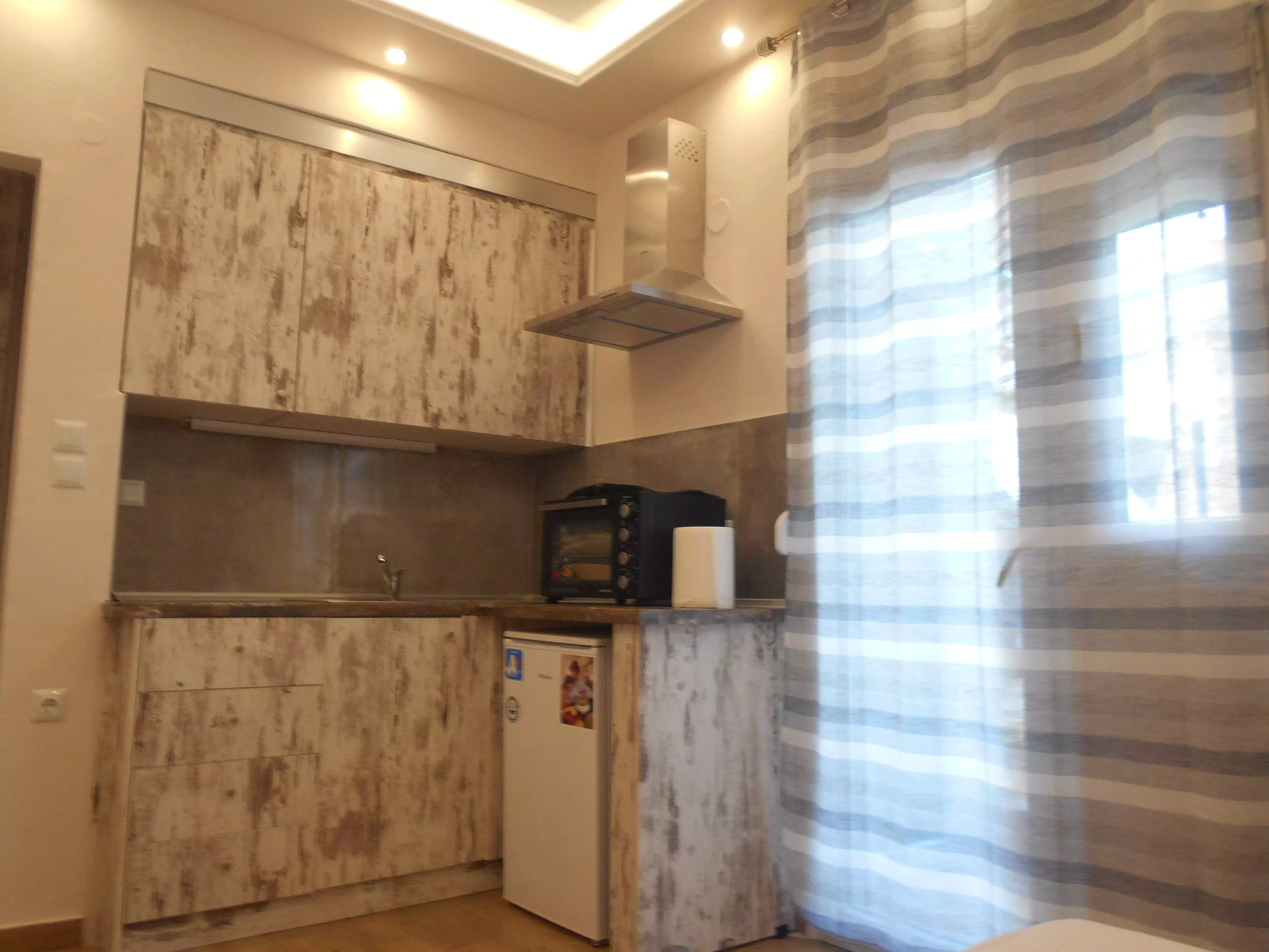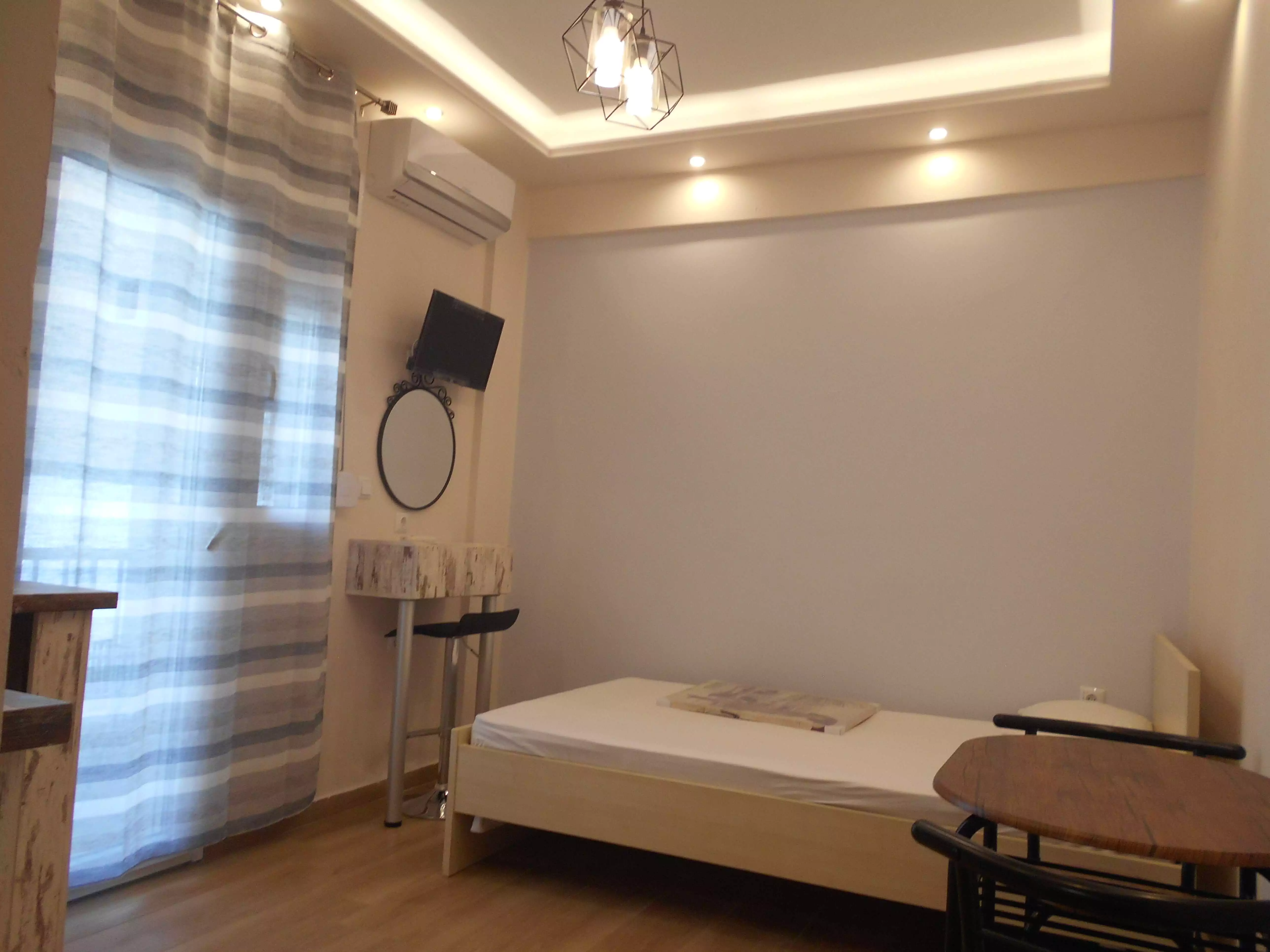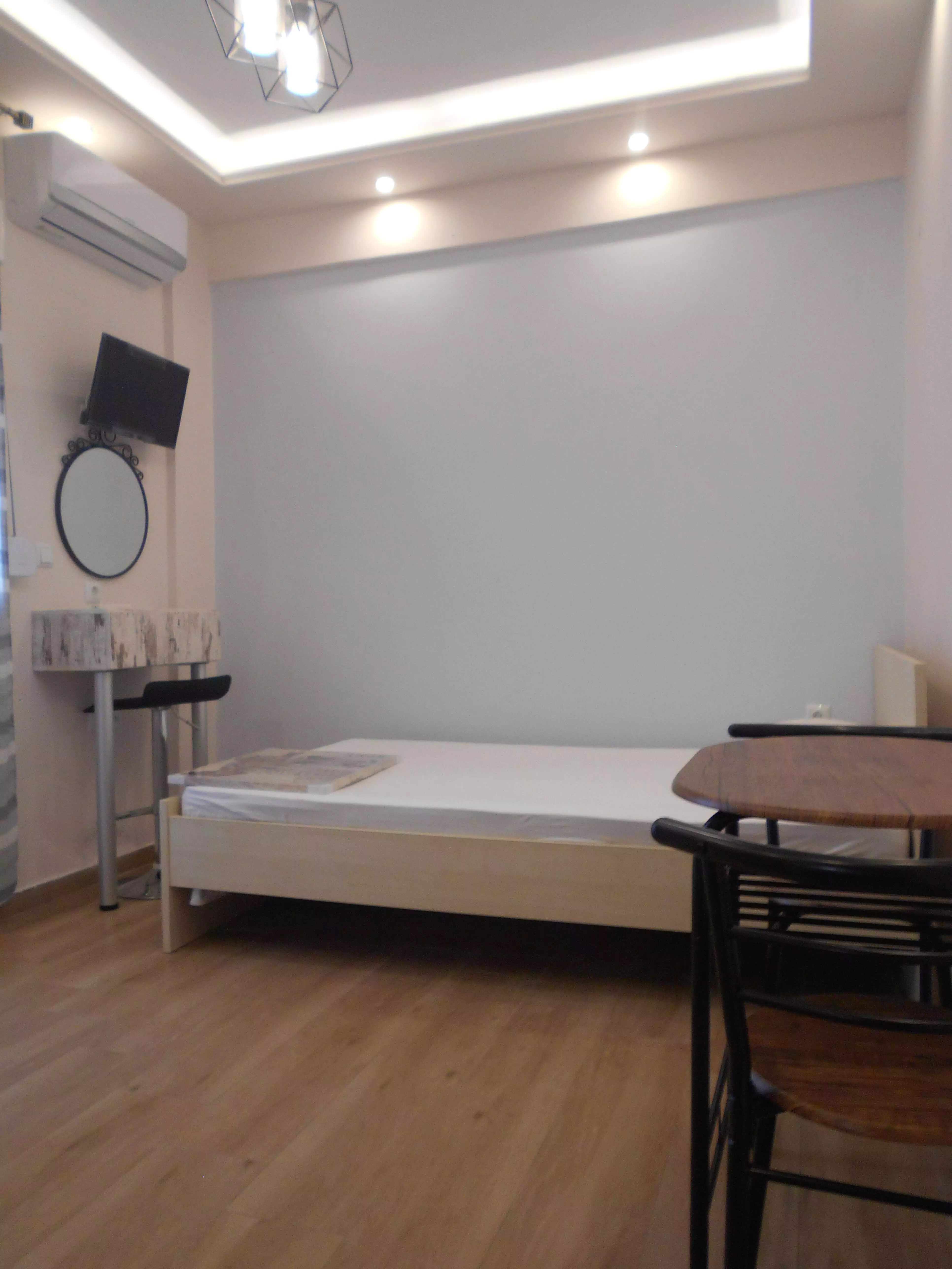 Ολική ανακαίνιση σε στούντιο 22 τ.μ. αποτελούμενο από ενιαίο χώρο υπνοδωματίου με εντοιχισμένη ντουλάπα, κουζινάκι, μπάνιο με ντουζιέρα και μπαλκόνι με κλειστό χώρο αποθήκευσης.